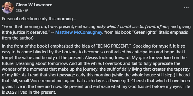 That was the portion of his book that I happened upon this morning. Just a small excerpt from a poem he placed down on the bottom of page 163. I reflected on his reasoning for a few minutes, carefully weighing the trade-offs between a life that prioritized and pursued direction over destination. To be honest, it isn’t the first time I have pondered that approach. And to be fair, Mr. McConaughey’s philosophy made perfect sense. As he explained in his own words, he wanted “direction and a sixteen-lane highway with room to swerve and explore along the way.” I get that sentiment. Completely. Life is an adventure. And we should learn to enjoy it along the way.